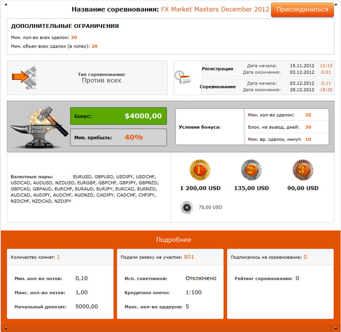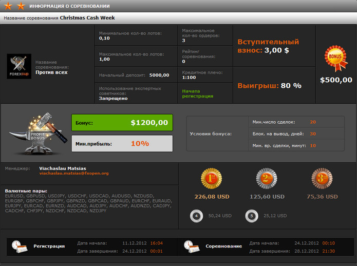 Участие в конкурсе бесплатное, а общий призовой фонд составляет 5 500$! Победитель станет управляющим PAMM ECN счетом с балансом $1200, а также получит бонус. Кроме того, каждый участник, который увеличит стартовый депозит на 40% и более, получит денежный бонус. Благодаря конкурсу «FX Market Masters December» вы сможете начать торговлю на реальном счету совсем скоро! Присоединяйтесь к турниру прямо сейчас, и удача не заставит себя ждать! ![]() Задача участников: В первый день конкурса каждому трейдеру начисляется 5 000$. Путем торговли на рынке Форекс необходимо увеличить стартовый депозит. Победителем становится трейдер, который по итогу конкурса будет иметь самый большой капитал. Основные даты: 2 декабря - заканчивается прием заявок 3 декабря - стартует конкурс 28 декабря - заканчивается конкурс 4 призовых места: 1 место – 1200$ + бонус 2 место – 135$ + бонус 3 место – 90$ + бонус 4 место – 75$ + бонус Все участники, у которых прибыль окажется более 40% получат денежные бонусы. Подробности конкурса размещены на сайте . |