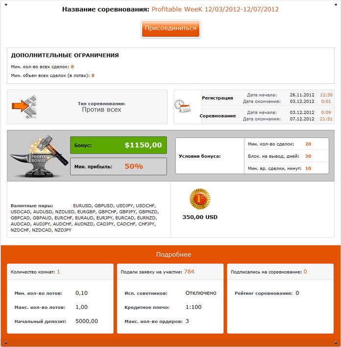 Несмотря на то, что турнир уже начался, регистрация продлена до 20 января! Все желающие могут присоединиться к конкурсу прямо сейчас! На данный момент в конкурсе участвуют 169 трейдеров, которые сражаются за главный приз турнира – должность управляющего PAMM ECN счетом с балансом более 1600$! Конкурс завершится 8 февраля! Подробности размещены на сайте ForexCup.com, там же можно зарегистрироваться в конкурсе. |