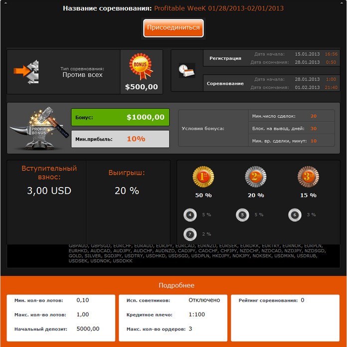 Приглашаем принять участие в недельном конкурсе «Profitable WeeK 01/28/2013-02/01/2013», который пройдет с 27 января по 1 февраля.