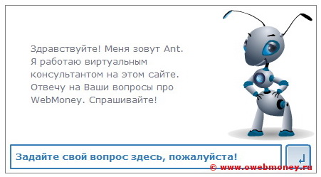 На сайте WebMoney появился новый житель - виртуальный консультант по прозвищу Ant. И, естественно, это муравей. К сожалению, поселили его далеко от посещаемых мест и проложенных юзерами троп - в разделе :